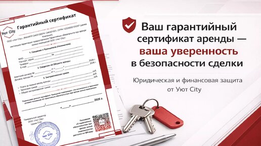 Гарантия безопасности аренды от «Уют City» Аренда жилья — важное решение. В «Уют City» мы заботимся о каждом клиенте и обеспечиваем полную защиту вашей аренды с помощью гарантийного сертификата. Что вы получаете? Юридическая проверка — тщательная проверка объекта и арендодателя, исключение рисков незаконного выселения и скрытых проблем.
