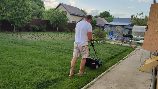 Как знают мои постоянные подписчики, в мае этого года я постелил почти 1,5 сотки рулонного газона перед домом. Обо всех этапах подготовки участка в прошлом году, выборе и процессе работы этой весной, на канале есть подробная информация в статьях и видео. Поэтому, кому интересно, добро пожаловать. Соответственно, для хорошего газона нужна газонокосилка. Ранее для обычной травы мы использовали бензиновый триммер. У меня он фирмы Хускварна и ему лет 10. Не особо мне с ним повезло. В первый же год использования дважды сдавал в ремонт по гарантии...