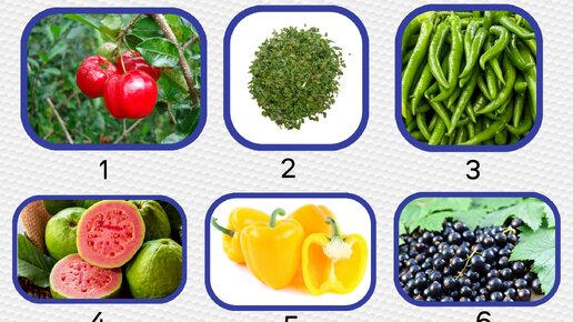 Где больше всего содержится? Рейтинг продуктов с максимальным содержанием Витамина С. 1. Барбадосская вишня - 1 677,6 мг на 100г 2. Кориандр (лист высушенный) - 566,7 мг на 100г 3. Перец чили зелёный острый - 242,5 мг на 100г 4. Гуава - 228,3 мг на 100г 5. Перец болгарский жёлтый - 183,5 мг на 100г 6. Смородина чёрная - 181,0 мг на 100г 7...