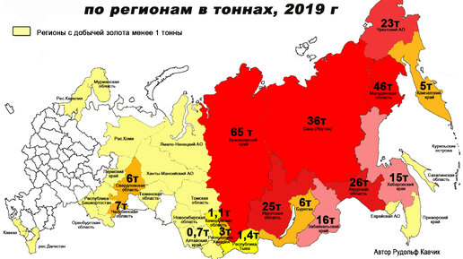 Искать золото нужно там, где его больше всего находят, добывают. В этой статья, я привожу обзорную карту по регионам с указанием добытого золота в тоннах. Как видите, это большая часть нашей страны, где можно добывать золото, почти на всей территории есть драгоценный желтый металл - золото. Крупнейшая добыча золота ведется в Сибири. Общее производство золота в России в 2019 году составило - 343,54 тонн, при населении в 140 миллионов. Сколько грамм на душу населения?
