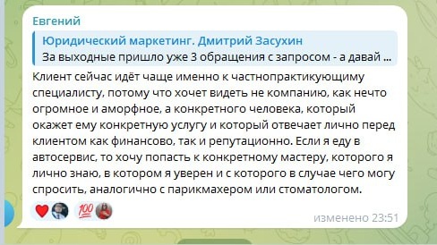 Есть большое заблуждение среди юристов, что клиенты ищут частнопрактикующего специалиста и что тренд идет в этом направлении. На мой взгляд, таким образом, частнопрактикующие юристы пытаются убедить себя в успешности и безопасности своей бизнес модели. На самом же деле, рынок стремится к укрупнению и позиционирование на рынке смещается с "я специалист" до "мы команда специалистов". Подобные тренды видны повсюду - врачи начинают работать вместе и организовывают клиники, автослесари открывают автосервисы, а повара собирают команды и открывают рестораны...