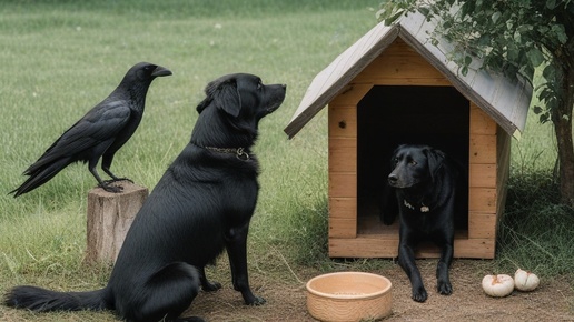 У нас в деревне возле дома в будке жил пес, Черныш. Был он симпатичный, черный и добрый. Но сидел на короткой цепи и иногда лаял на редких прохожих, включая почтальона. Держал марку. Как-то раз хозяйка принесла Чернышу еду в глубокой алюминиевой миске. А недалеко на ветке яблони сидела ворона. Увидела она такое дело, и у нее созрел коварный план. Подкравшись сзади к собаке, она цапнула его за хвост. Черныш от неожиданности присел и обернулся. Та отпрыгнула в сторону, посмотрела на миску, на собаку и ненадолго задумалась: миску-то не достать...