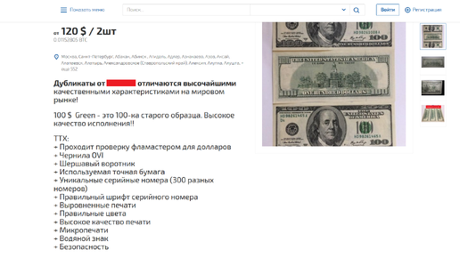 На одном, весьма известном магазине автопродаж в DarkNet весьма много предложений о продаже валют и рублей. За цену в диапазоне от 1000 до 3000 здесь можно купить 5000 купюру, от совсем "никакого" качества, до отличимой лишь в банке, по признакам не разглашаемым широкому кругу лиц. Оптом, конечно дешевле - 1 000 000 высшего качества можно найти за 300 000 - 400 000 рублей. Так как основной контингент этой торговой площадки - наркоманы, такого рода "быстрые" деньги пользуются спросом...