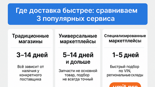 Скорость доставки — один из ключевых факторов при покупке автозапчастей. Когда автомобиль сломался, ждать неделями просто невозможно: каждый день простоя — это потерянное время, деньги и комфорт. Современные сервисы предлагают разные условия доставки, и именно от этого зависит, где покупка окажется действительно выгодной. Разберём, у кого доставка быстрее: у традиционных магазинов, универсальных маркетплейсов или специализированных площадок для автозапчастей. 1. Традиционные магазины автозапчастей Как работает доставка Магазины обычно работают с ограниченным числом поставщиков...