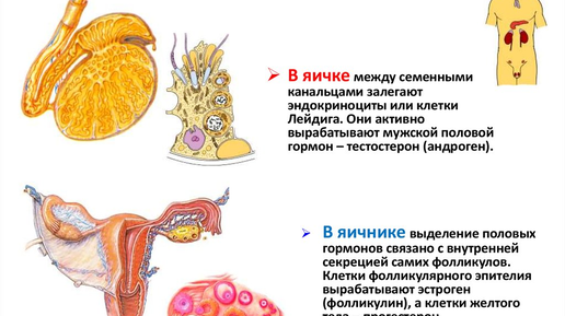 Яичко (семенник) у мужчин и яичники у женщин, кроме половых клеток, вырабатывают и выделяют в кровь половые гормоны, под влиянием которых происходит формирование вторичных половых признаков. Эндокринной функцией в яичке обладает интерстиций, который представлен железистыми клетками — интерстициальными эндокриноцитами яичка, или клетками Лейдига, которые располагаются в рыхлой соединительной ткани между извитыми семенными канальцами, рядом с кровеносными и лимфатическими сосудами. Интерстициальные эндокриноциты яичка выделяют мужской половой гормон — тестостерон...