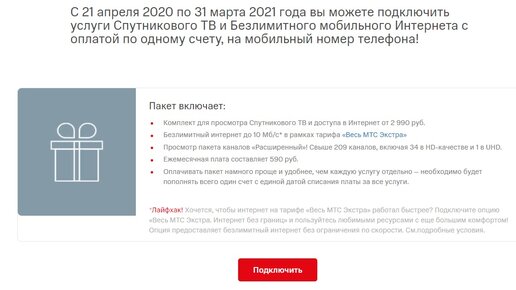 Если вы живете в Москве и собираетесь подключить домашний Интернет от МТС, вас будут ждать три тарифных плана, с разной скоростью: 200 мбит/сек, 500 мбит/сек и 1 Гбит/сек, все тарифы безлимитные и не имеют ограничений на скачивание файлов. Wi-Fi роутер —99 ₽/мес. К сумме тарифа нужно обязательно добавить 99 рублей за каждый месяц пользования, если у вас имеется свой роутер, подключить его не получиться, дело в том, что МТС использует оптоволокно, а в обычном покупном роутере нет такого разъема. О...