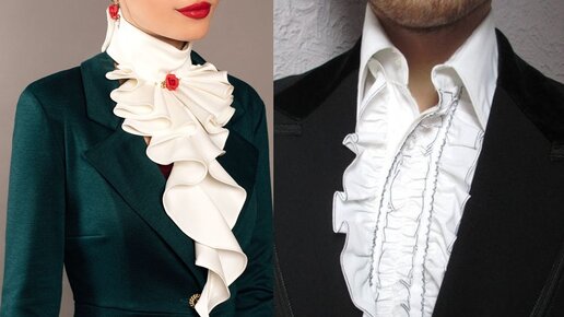 А вот жабо – скажу я вам, преинтереснейшая деталь костюма! Прямая отсылка к дворянским корням. Очень динамичная штука, очень. Им можно трепетать в любовной истоме, жарко вздымая грудь, или гневно трясти, преисполнившись праведным негодованием, тут уж все зависит от вашего желания и настроения. Но по жабо сразу понятно, трепещет оно или трясется, это уж как пить дать. Жабо появилось в 18-м веке, во Франции, и слово «Jabot» означает – птичий зоб. Это воротник, причем мужской воротник, который эволюционировал из тонкой средневековой ниточки до целого ЖАБО восемнадцатого столетия...
