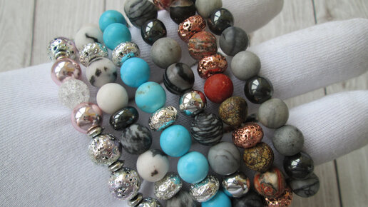Сборка браслетов на резинке натуральные камни, керамические бусины.