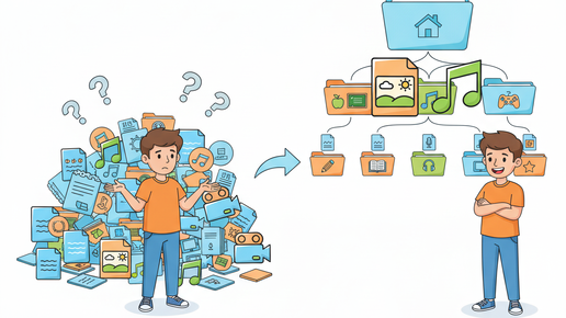 Привет! Если твой компьютер превратился в свалку файлов с названиями типа "asdfsdf.txt" и "Безымянный (47).doc" — эта статья для тебя. Сейчас разберёмся, как навести порядок и стать настоящим мастером файловой системы. Представь, что компьютер — это твоя комната. Файлы — это вещи в ней: учебники, тетради, постеры, игрушки. У каждой вещи есть название, по которому ты её находишь. Файл — это порция информации с именем, которая хранится в памяти компьютера. Твоя любимая песня? Файл. Фото с последней тусовки? Файл...