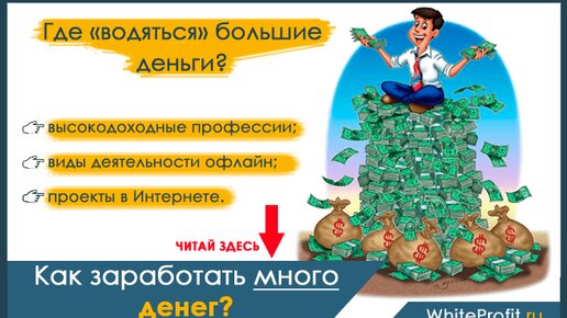 Когда человек устаёт годами жить от зарплаты до зарплаты и экономить каждую копейку, то задаёт себе вопрос: «Как заработать много денег?». А ответ лежит на поверхности. Надо перестать заниматься тем, что ведёт к бедности, и освоить другое направление. Более востребованное, перспективное и денежное. В этой статье вы узнаете, как заработать большие деньги, и сколько времени вам потребуется для достижения цели. Из этой статьи вы узнаете: Можно ли заработать много денег без вложений? Так хочется сказать, что заработать большие деньги без вложений реально...