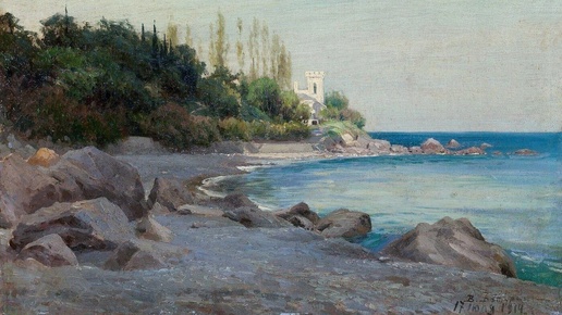 Батурин Виктор Павлович (1863-1938) Мыс Ай-Панда. Крым, 1914  Холст, масло. 34,5 х 50 см  Частное собрание, Австрия  Урочище Ай-Панда находиться в Симеизе. Именно там находится имение Ай-Панда" И. С. Мальцова...