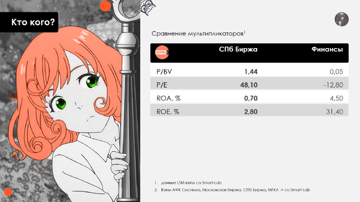 • ROA = 0,70% и ROE = 2,80%. P/S не привожу, ибо буквального Sales у эмитента нет. EBITDA... будто бы для финансового сектора её тоже не считают, хотя на Smart-Lab есть. Также я воздержусь от специфических коэффициентов, присущих финансовому сектору, ибо не вижу в этом особо смысла — у бизнеса явно проблемы...