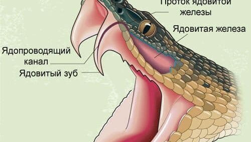 В височной части змеи головы находятся железы, вырабатывающие яд.от этих желез яд по каналу выступает в два трубчатых зуба, расположенных в верхней челюсти. У некоторых замедленное этих зубов достигает 4-5 сантиметров. Когда такая змея находится в спокойном состоянии, её зубы прижаты к нёбу наподобие складного ножика. Моменты курсы зубы выпрямляются и выдвигаются вперёд...