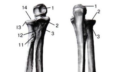 Локтевая кость, ulna, в области проксимального эпифиза имеет два отростка: верхний локтевой, olecranon, и нижний венечный, processus coronoideus, которые ограничивают блоковую вырезку, incisura trochlearis, предназначенная для сочленения с блоком плечевой кости. На латеральной стороне венечного отростка имеется лучевая вырезка, incisura radialis, с которой сочленяется головка лучевой кости, а ниже и сзади – бугристость, tuberositas ulnaе. Дистальный эпифиз имеет головку, с медиальной стороны от которой отходит шиловидный отросток, processus styloideus...