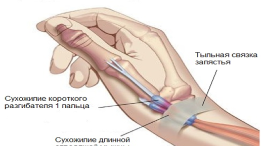 Стенозирующий лигаментит тыльной связки запястья характеризуются поражением влагалища сухожилий короткого разгибателя и длинной отводящей мышцы большого пальца кисти, которые проходят в одном очень узком канале. При перегрузке возникает хроническое асептическое воспаление надкостницы шиловидного отростка лучевой кости с последующим рубцовым перерождением и укорочением тыльной связки и сухожилий мышц I пальца. Болезнь развивается медленно, обычно начинается с появления болей (старое название...