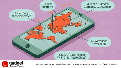 Компания Apple отличается тем, что не производит компоненты для своих устройств, а вместо этого использует производителей со всего мира. Например, дисплеи для айфонов в основном производятся в Японии компаниями Japan Display и Sharp, в то время как сенсорный датчик Touch ID делают на Тайване компании TSMC (Taiwan Semiconductor Manufacturing Company) и Xintec. А вот стекло дисплея для iPhone и iPad изготавливаются американским изготовителем Corning и поставляется из Кентукки. Еще в США делают различные чипы для устройств Apple, а также оборудование для производства iPhone...