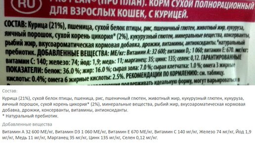 Сухой корм для кошек Pro Plan (ПроПлан) производится американской компанией Purina (Nestle Purina PetCare Company, США). Производство осуществляется на заводах во Франции, Италии и России. Официальный сайт корма — https://www.proplan.ru/ , на нем есть информация о составах всей линейки, нормы кормления и т.д. Кроме корма премиум класса Pro Plan компания Purina так же производит корма для кошек и собак One, Felix, Friskies, Darling, Cat Chow, Gourmet. Состав корма Изучим состав корма Pro Plan на примере варианта Adult Optirenal (для взрослых кошек с курицей)...