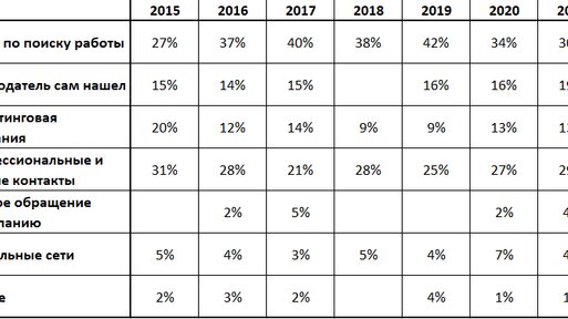 Клиенты и подписчики частенько спрашивают меня, где в текущих условиях искать работу. Забегая вперед, скажу, что сильно ситуация с эффективностью каналов поиска работы не изменилась за последние несколько месяцев. Для наглядности привожу вам таблицу по процентам трудоустройств через различные каналы по данным «Исследования рынка труда и обзора заработных плат» компании Antal за последние 7 лет (с 2015 по 2021 годы). Компания ежегодно исследует эффективность пяти основных каналов. Конечно, выбор каналов продвижения зависит от уровня позиции и стратегии поиска работы...