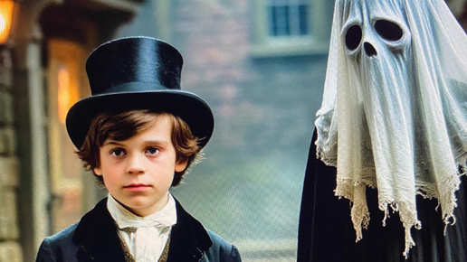 ИИ Шедеврум Скрудж видит призрака, который безмолвно приближается к нему, закутанный в чёрную мантию. Призрак огромного роста, его присутствие наполняет душу Скруджа ужасом. Скрудж спрашивает у призрака, покажет ли он ему тени вещей, которых ещё нет, но которые будут. Дух приближался — безмолвно, медленно, сурово. И когда он был совсем близко, такой мрачной таинственностью повеяло от него на Скруджа, что тот упал перед ним на колени. Черное, похожее на саван одеяние Призрака скрывало его голову, лицо, фигуру — видна была только одна простертая вперед рука...