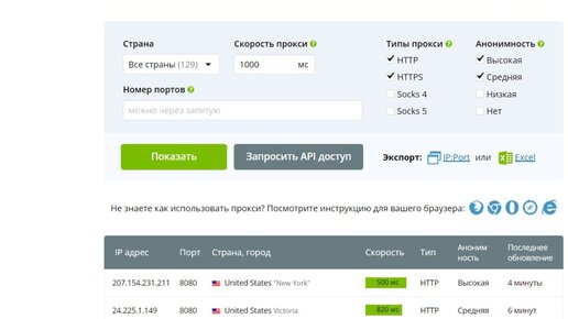 Например нам нужны HTTP/HTTPS прокси из США, скорость до 1000мс и с высокой и средней анонимностью...