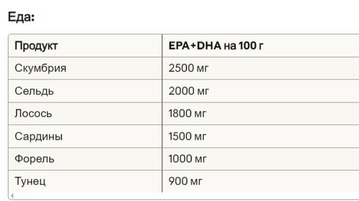 Сколько нужно принимать? Минимальная эффективная доза: 500 мг EPA+DHA в день (для общего здоровья) Оптимальная доза: 1000-2000 мг EPA+DHA в день (для кожи, волос, мозга) При воспалениях (акне, артрит): 2000-3000 мг EPA+DHA в день Соотношение EPA:DHA: Для противовоспалительного эффекта: больше EPA Для мозга и нервной системы: больше DHA Универсально: 2:1 или 3:2 (EPA:DHA) Источники омега-3 Чтобы получить 1000 мг EPA+DHA: 50-60 г жирной рыбы в день Или 2-3 порции рыбы в неделю Реальность: Большинство людей едят рыбу 1-2 раза в месяц...