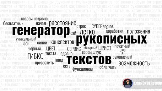 Во время карантина, на домашнем обучении от учеников и студентов постоянно требуют фотографии конспектов из тетради. И каждый понимает, как сложно дается несколько часов рукописного ввода. Но зачем напрягаться, если есть возможность облегчить труд? В этой статье, мы хотим рассказать о бесплатном генераторе, который поможет превратить печатный текст в рукописный. Ссылка на сайт - https://handwritter.ru/. Данный сервис начал работу совсем недавно и по этому могут возникать различного рода ошибки...