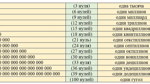 В прошлой статье рассказывала о том, как можно поработать с большими числами. И тут я вспомнила, что у меня был запрос — помогла решать задачу с делением, а именно, нужно было ответить на вопрос: во сколько раз один миллиард больше одного миллиона? А ведь на эти вопросы можно также ответить с помощью таблицы названий больших чисел. Итак, снова берём за основу таблицу: При умножении мы подсчитывали общее количество нулей сложением. А при делении нужно вычитать. Итак, в одном миллиарде 9 нулей, а в одном миллионе 6 нулей: 9 – 6 = 3...