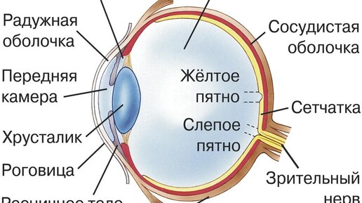 Глазное яблоко представляет собой шаровидное тело, заложенное в глазнице. Имеет ядро и 3 оболочки: -Фиброзная (tunica fibrosa bulbi) -Сосудистая (tunica vasculosa bulbi) -Сетчатая (tunica sensorial bulbi) или сетчатка (retina) Оболочки: -Фиброзная оболочка (tunica fibrosa bulbi). Находиться снаружи глазного яблока, играет защитную роль. В заднем отделе она образует склеру, а в переднем — прозрачную роговицу. 1) Склера или глазной белок (sclera)– состоит из плотной соединительной ткани и имеет белый цвет...