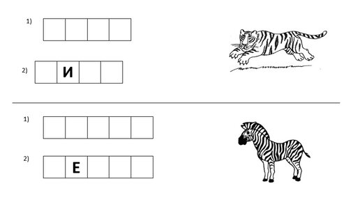 Занятие 29 Задачи: Развивать умение проводить звуковой анализ слова. Закрепить понятия: «гласный звук», «гласный ударный звук», «твёрдый/мягкий согласный звук». Закрепить понятия «звук», «слово». Продолжать формировать представление о гласных и согласных буквах, как знаках для обозначения гласных и согласных звуков. Развивать умение читать слоги, слова, небольшие тексты. Материал: Наглядный: картинки (зебра, тигр); цветовые схемы (скс, скск, зксск, зкск); изученные буквы. раздаточный: карточки (дифференцированные...