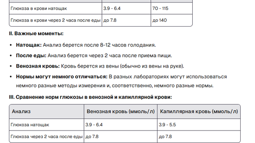 Уровень глюкозы в венозной крови обычно немного ниже, чем в капиллярной крови (из пальца), поскольку глюкоза используется клетками по мере прохождения крови через ткани. Однако разница обычно невелика и находится в пределах допустимой погрешности. I. Нормальные значения уровня глюкозы в венозной крови: IV. Интерпретация результатов: V...