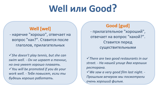 Сегодня мы рассмотрим разницу между good И well – хороший/хорошо. У многих людей, изучающих английский язык, возникают трудности при употреблении этих слов. И это не удивительно, ведь они так близки по значению, но все же разница в их использовании есть...