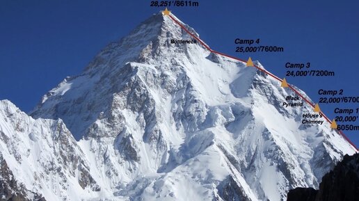 К2 или Чогори на местных картах считается среди восьмитысячников горой-убийцей неспроста. По данным на июнь 2018 года уровень смертности составил 23 % на 367 попыток восхождений. Впервые в истории стран бывшего СССР на вершину поднялись 1 августа 1992 года Владимир Балыбердин (Россия) и Геннадий Копейка (Украина), 3 августа 1992 года — Алексей Никифоров (Россия) в составе международной экспедиции под руководством Балыбердина. Недавно на нее сходила экспедиция "7 вершин" под руководством Александра Абрамова...