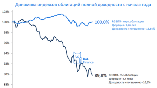 или какое уже по счету дно? Мы вкладываем в надежный (надеюсь 😅) и доходный корпорат: 👵Портфель бабули 👶Портфель внучков Но не можем обойти супер актив – ОФЗ! RGBITR вновь у минимальных значений. TR в конце индекса означает total return – т.е. индекс учитывает поступающие купоны и их реинвестирование. Даже купившие на дне в феврале-марте 2022 года – в убытках. По сути, для гос.облигаций это потерянное десятилетие Таит ли это инвестиционные возможности, или дешевость графика обманчива и зря зазывает? Сегодня средневзвешенная доходность облигаций в индексе дает 16,6%...