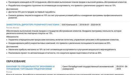 Пример резюме директора розничного магазина 2025 - руководство