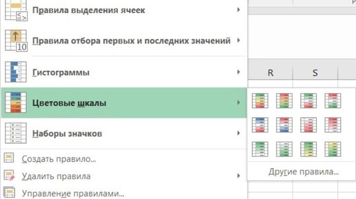 Переходим к Цветовым шкалам. Варианты представлены на рисунке 4.1. Для примера выберем два варианта цветовых шкал. На рисунке 4.2. показан вариант Зелный-жёлтый-красный. Применение цветного градиента к диапазону ячеек. Оттенок цвета зависит от относительной величины значения по срвнению с другими ячейками в дивпазоне...