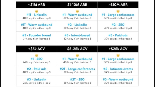 Каким был B2B GTM в 2025 году? GTM — это машина, которая либо сжигает деньги стартапа подчистую, либо умножает оценку в 10 раз. Фаундерам, конечно, хочется оказаться во втором случае, но что делать? Кайл Пойяр из Growth Unhinged подготовил большой отчёт с данными 195 лидеров SaaS и AI-стартапов ($1-10M ARR). Спойлер: 2025 был годом экспериментов, 2026 — время жестко (и даже беспощадно) масштабироваться. А теперь перейдём к 5 главным инсайтам. 1️⃣ Inbound — не панацея 23% компаний ставят на inbound-маркетинг, 19% — на outbound, 18% — на account-based GTM...