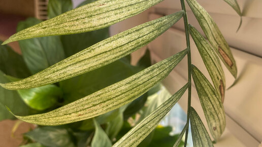 Никогда не была большим цветоводом и не претендую. Какое-то время назад «потянуло к земле»😅😅, пока только в виде комнатных цветов) Начиная с герани, дошла до 9 горшков: несколько гераней, спатифиллумы, драцена, хамедорея и каланхоэ. И вот что-то происходит с хамедореей. На листьях есть белый налет, какие-то стали сухо-коричневые...
