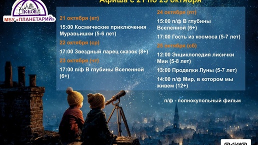 «Хотел бы я знать, зачем звёзды светятся… Наверно, затем, чтобы рано или поздно каждый мог вновь отыскать свою» ✨ ⭐️ Афиша псковского планетария на неделю с 21 по 25 октября. Оставайтесь с нами #Наш