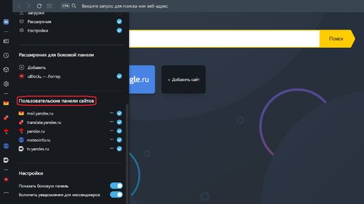 Opera браузер. Боковая панель - пользовательские панели сайтов