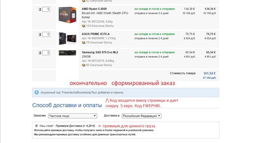 Как делаю заказы электроники с немецкого интернет магазина. Информация для тех, кто хочет покупать комплектующие с Европы, новые, в оригинальной упаковке по хорошей цене. Всем привет вот и обещанный пост, купил ещё неделю назад, но только сейчас магазин всё собрал запаковал и отправил. И так что Вам примерно нужно знать если Вы первый раз делаете заказ железок от немцев: Не забудьте про премиум доставку если сомневаетесь в нашей почте или путь далек. И конечно можете воспользоваться моим кодом на скидку, минус 5 евро для нового покупателя, код «FWEPHBI»...