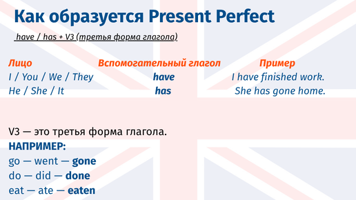 have / has + V3 (третья форма глагола) Лицо Вспомогательный глагол Пример I / You / We / They have I have finished work...