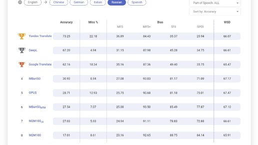Согласно исследованию международного независимого бенчмарка DiBiMT, «Яндекс Переводчик» лучше других языковых моделей и онлайн-переводчиков перевёл текст с английского на русский язык. Бенчмарк DiBiMT — это эталонный тест для измерения процента ошибок в машинном переводе. Наряду с «Яндекс Переводчиком» тестирование проходили Google Translate и DeepL, а также открытые большие языковые модели: mBART-50, M2M100 и проект OPUS. Исследователи собрали базу данных из нескольких тысяч предложений на английском языке с омонимами — одинаковыми по написанию словами, имеющими разное значение...