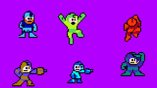 Спрайты по мотивам видеоигры MegaMan для приставки Денди. 8 Битный человечек такой. В костюме. Прыгает и бегает. Довольно сложная игра. Помню, запускал на игру на приставке. И сильно далеко там не доходил. Но всегда нравилась графика. Выглядит игра хорошо. Движения классные. Просто сложновато было. А это мои спрайты по мотивам MegaMan. Челик и его друзья. Кто-то мутант, кто-то подводник. Рыжий чел с бородой. Бородач. И кто то в оранжевом костюме, которому надо куда то залезть. И чел у которого всегда настолько классное настроение, что и костюм у него самый светло зеленый...