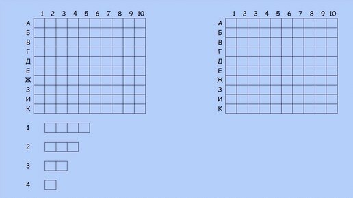 1. Морской бой Эта игра для двоих игроков. Её цель – потопить все корабли противника. Корабли располагаются на двух квадратных полях размером 10 на 10 клеток. Строки обозначаются цифрами, столбцы - буквами. На своём поле вы располагаете корабли, и противник наносит по ним удары. А на другом поле противник располагает свои корабли, по которым "стреляете" вы. При расстановке кораблей учитывайте, что между ними должна быть хотя бы одна пустая клетка, нельзя ставить корабли вплотную. В свой ход игрок выбирает клетку на поле противника и «стреляет», называя её координаты: «Д9», например...