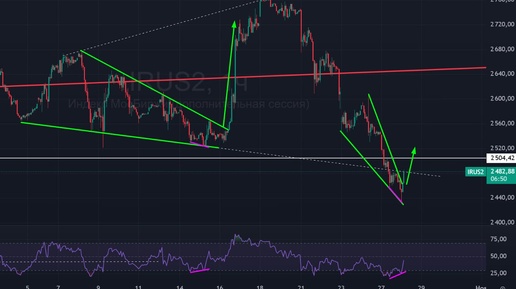 🏦 Индекс Мосбиржи 🟢 Возможно, зреет вторая резинка по индексу. В первой половине октября формировался клин, из которого потом был выход вверх. В данный момент еще один клин, из которого происходит выход вверх...