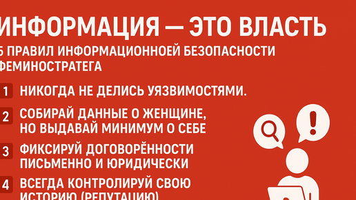 🦉 Информация — это власть (феминостратегический разбор) Матриархат построен не только на законах и ресурсах, но и на информации: 👉 Контроль над информацией = контроль над поведением мужчин. Женщина часто это не только «эмоции», но и информационный агент матриархата. Женщина не всегда сильнее физически, но информационно она вооружена лучше, чем неподготовленный мужчина...