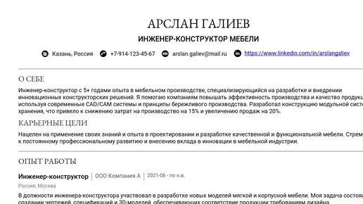 Резюме Инженера-Конструктора Мебели 2025: Образец