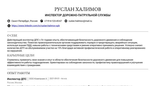 Пример резюме инспектора ДПС поможет вам понять, как создать свой лучший документ. Изучение готовых примеров — ваш самый быстрый путь к эффективному резюме и заветной должности. В этой статье вы найдете пошаговые инструкции о том, как составить эффективное резюме инспектора ДПС с нуля или улучшить существующее. Мы собрали готовые примеры для начинающих и опытных специалистов, учитывая актуальные требования работодателей. Вы узнаете, как правильно представить Изучив пример, вы сможете создать резюме с помощью нашего конструктора резюме 🚀 Заголовок резюме – это первое, что видит работодатель...