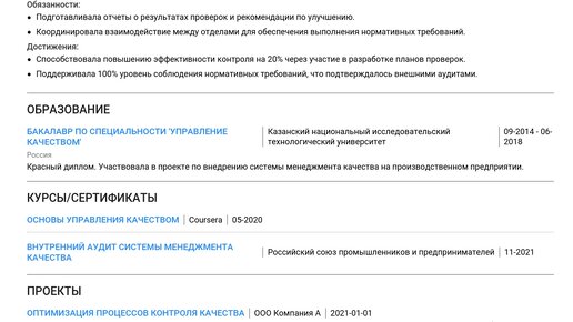 Ищете пример резюме инспектора ОК, который поможет вам составить свое эффективное резюме и получить работу? 🚀 На этой странице вы найдете все необходимое для создания сильного резюме инспектора ОК, независимо от вашего опыта: Изучив пример, вы сможете создать резюме с помощью нашего конструктора резюме. Мы даем четкие инструкции, которые помогут как начинающим специалистам, так и опытным инспекторам ОК составить резюме, полностью отвечающее требованиям HR. ✅ Заголовок резюме должен быть четким, конкретным и отражать вашу специализацию...