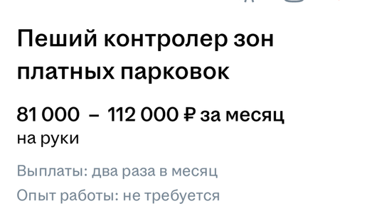Инспектору платных парковок платят в Москве от 81 000 до 121 000 рублей. Также предусмотрен полный социальный пакет, включая компенсацию питания (300 рублей в день), оплату проезда на общественном транспорте и расходы на мобильную связь. Кроме того, сотруднику спустя три месяца работы выдадут униформу и специальную обувь. Сходил на собеседование и узнал, что скрывается за всеми этими привлекательными условиями. Работа инспектором парковок предполагает администрирование зон платной парковки, контроль...